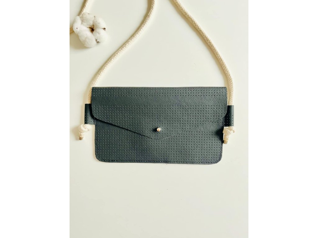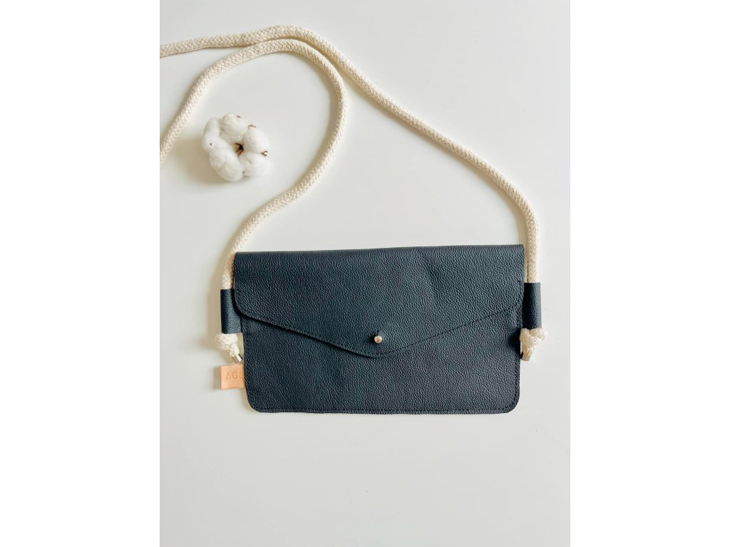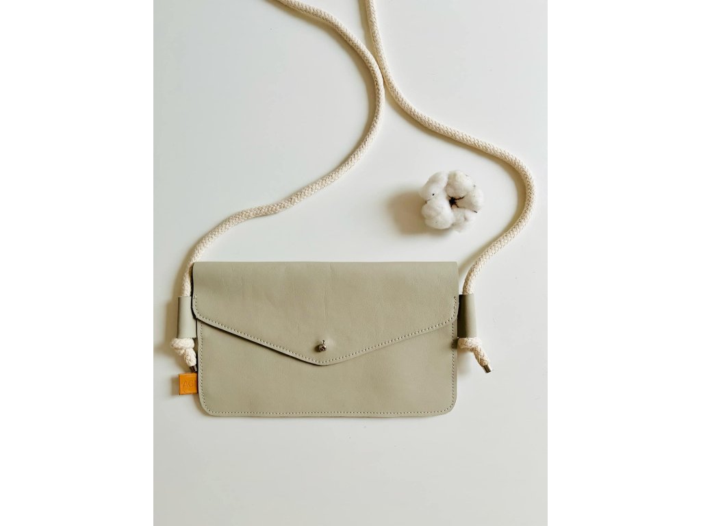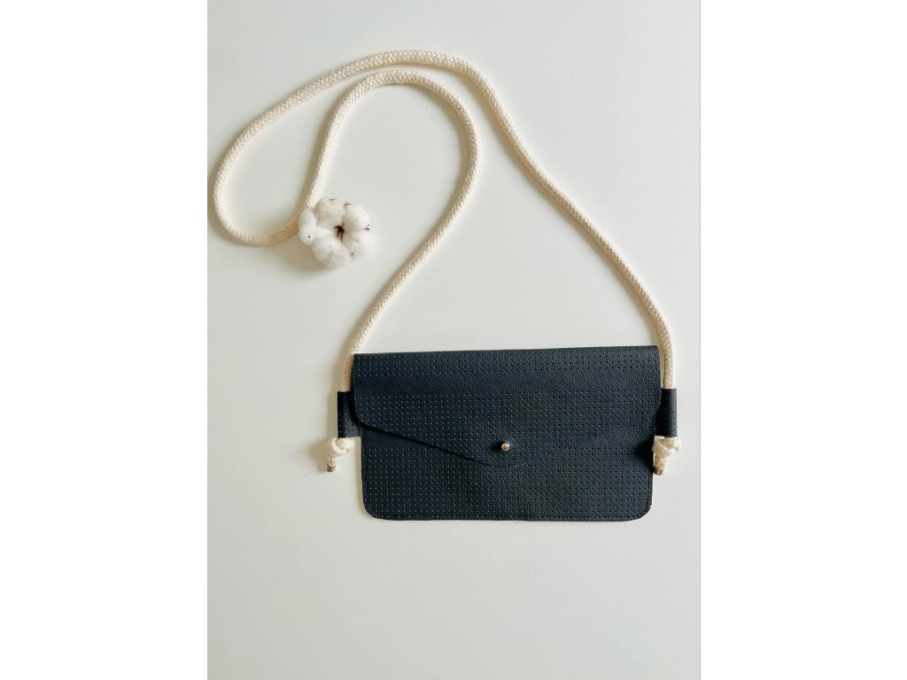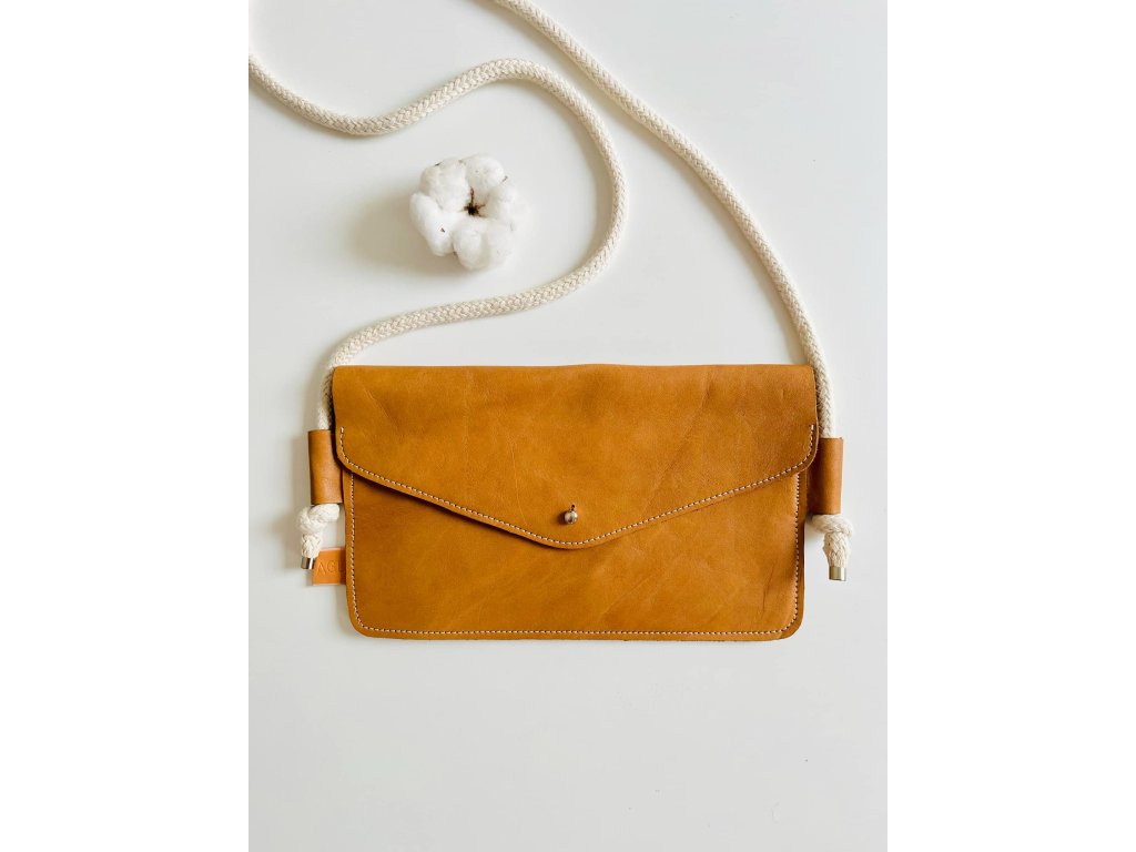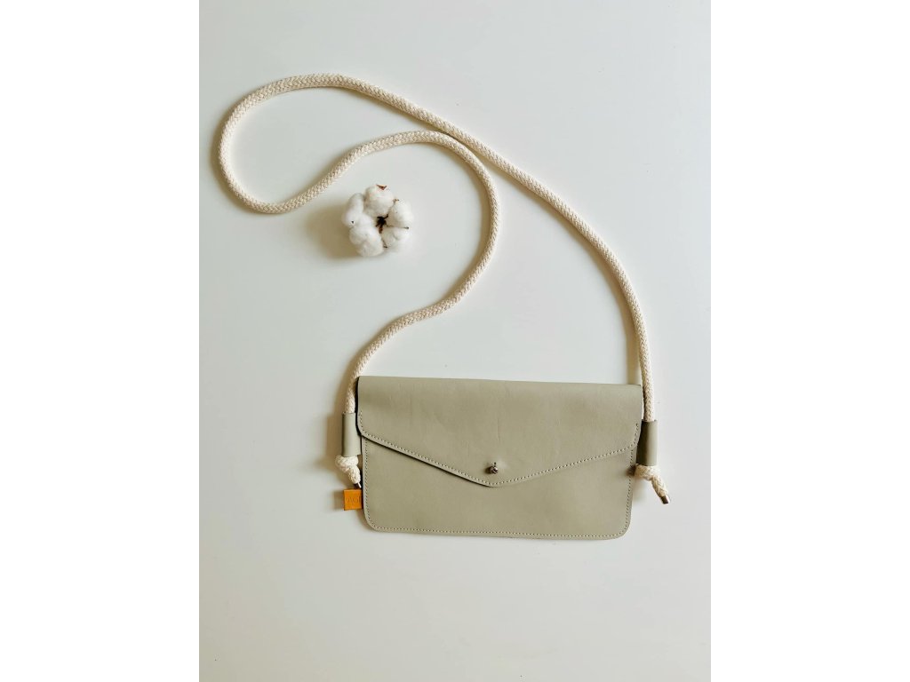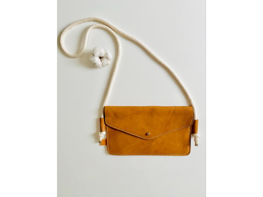 Kabelka je vyrobena z upcyklované hovězí kůže z autoprůmyslu, má uvnitř přepážku ze stejné kůže. Uzavíratelná na sedlářský knoflík. Popruh kabelky je z bavlněné šnůry.